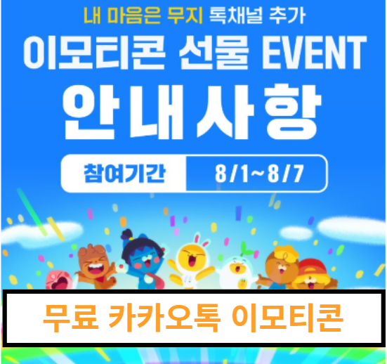 8월 1일부터 8월 7일까지 내 마음은 무지 채널추가만 하면 카카오톡 이모티콘이 무료로 제공됩니다. 방법 아주 간단합니다.